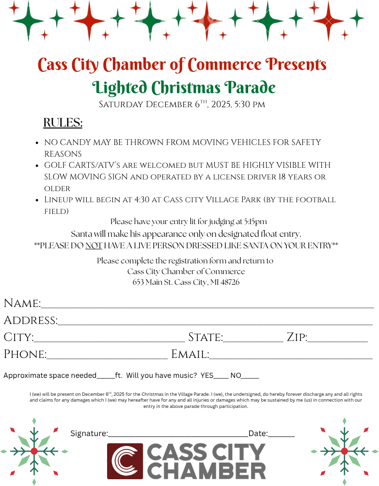 Celebrate the holiday season in Cass City, MI with a joyful day of festivities for the whole family! Kick off the morning from 9:00 to 9:45 a.m. with Breakfast with Santa at VFW Post 3644, where kids can meet Santa and enjoy a delicious meal in a warm, festive atmosphere. This special event is proudly sponsored by McDonald’s Restaurant, Dairy Farmers of America, Ben's Supercenter, and VFW Post 3644. Don’t miss this heartwarming start to a day full of holiday cheer throughout the Cass City community!